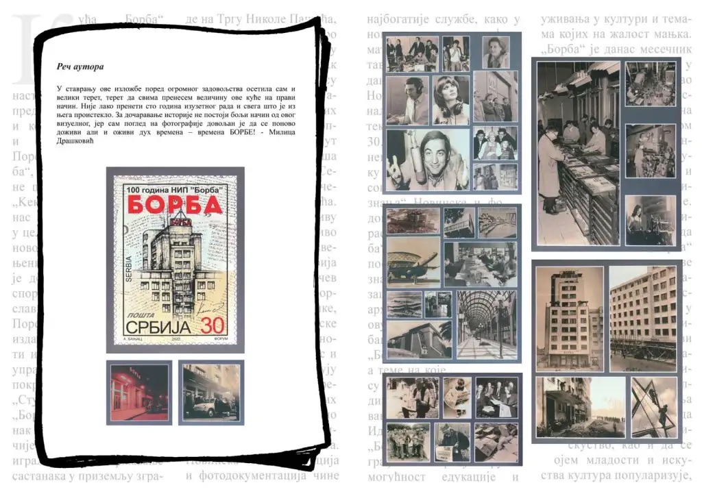 Поставка обухвата око 200 фотографија изложених у 15 целина које обједињују настанак и рад куће „Борба“, почев од изгледа зграде, насловних страна Борбиних издања, штампарије, али и акција редизајнираног часописа које су одржане у протекле две године.